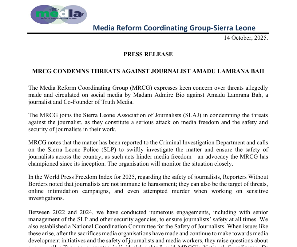 The Media Reform Coordinating Group (MRCG) expresses keen concern over the threats allegedly made and circulated by Madam Admire Bio, also known as Mama of Freetown, against the journalist and Co-Founder of Truth Media, Ahmadu Lamrana Bah.