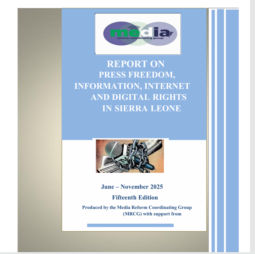 This Report, which addresses issues on ‘Freedom of Expression and of the Press, Access to Information, and Internet Freedom and Digital Rights in Sierra Leone,’ is the Fifteenth in a series produced by the Media Reform Coordinating Group (MRCG) as part of a project titled “Enhancing Press Freedom and Media Reforms”, supported by the National Endowment for Democracy (NED) in the United States of America. The Report, which covers the period June to November 2025, is the outcome of the monitoring of the exercise and legal guarantees of freedom of expression and the press, and internet freedom and digital rights issues in Sierra Leone, including invitations, intimidation, attacks, assaults, arrests, detentions, and prosecution of journalists and other citizens; and also tracks media performance.